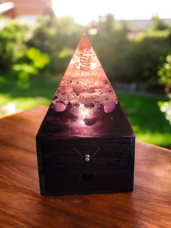 Set atop a hand-finished wooden jewellery box, the Celestial Drift lamp includes a hidden charging station beneath the orgonite pyramid—perfect for cleansing and energising your jewellery, crystals, and sacred objects.